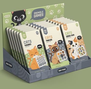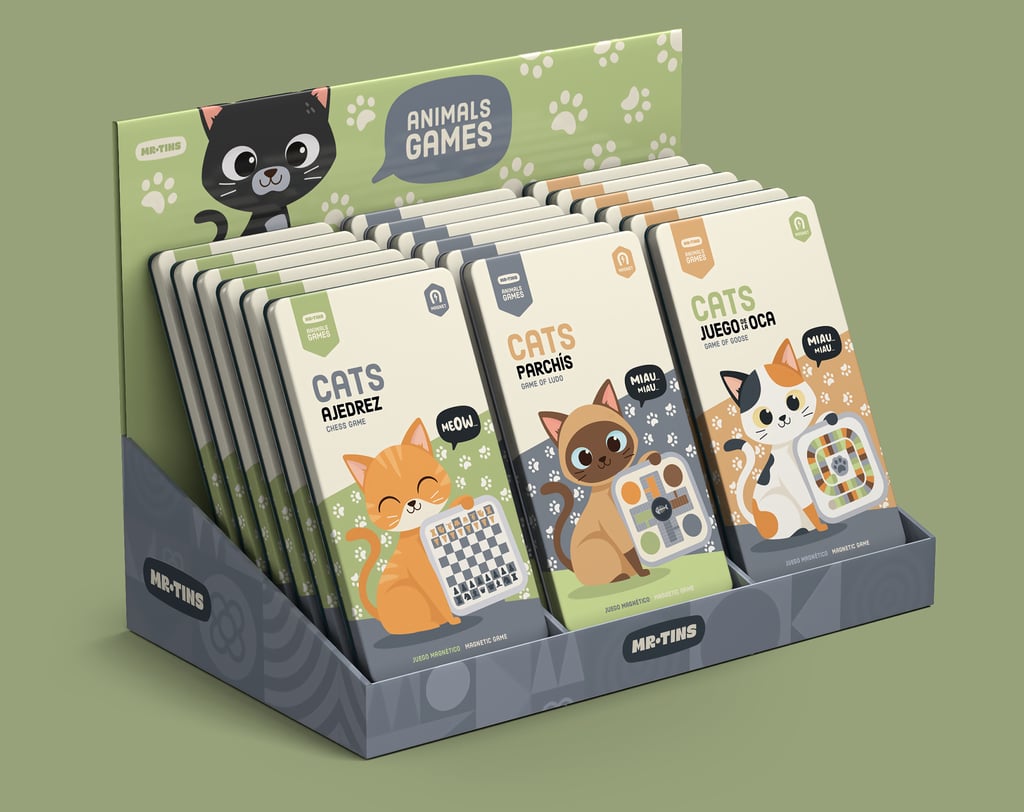Expositor ligero y funcional fabricado en cartón resistente, diseñado específicamente para la presentación de los juegos magnéticos. Su estructura sencilla y compacta incluye separadores entre columnas que facilitan la organización y la estabilidad de los productos. Dispone de tres columnas donde las latas se apilan de forma ordenada, dejando visibles las tres primeras de cada columna, lo que permite una presentación clara y atractiva.