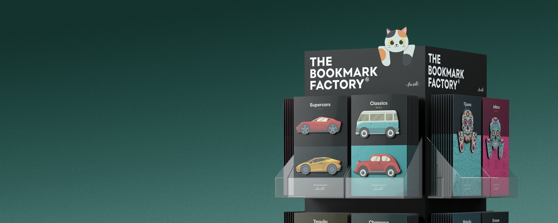 Los puntos de libro magnéticos de The Bookmark Factory son prácticos, resistentes y totalmente personalizables. Cada expositor puede reunir distintas colecciones, adaptándose al estilo de tu tienda o a los gustos de tus clientes. Con sus diseños temáticos, son recuerdos originales que combinan creatividad y funcionalidad.