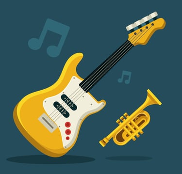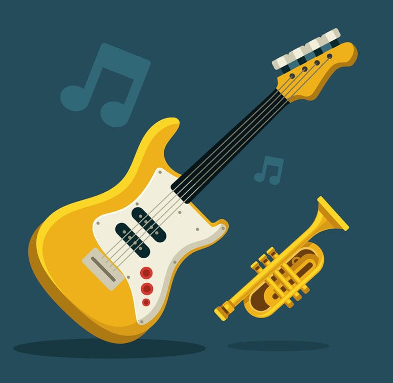 Guitarras, bajos y pianos ilustrados con detalle y humor. Una colección musical que inspira creatividad y ritmo en cada página.